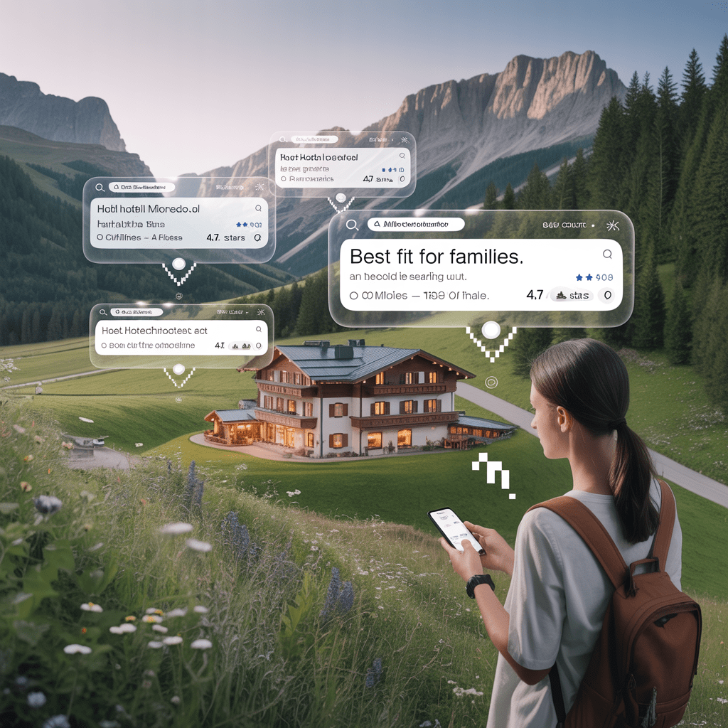 Ein Beispiel: Ein Gast fragt ChatGPT: „Ich suche ein Ferienhotel in Tirol mit direktem Zugang zur Skipiste, Wellness-Bereich und Halbpension für eine Familie mit zwei Kindern.“ Die KI antwortet direkt mit einer Empfehlung – ohne dass der Gast jemals Ihre Website besucht.